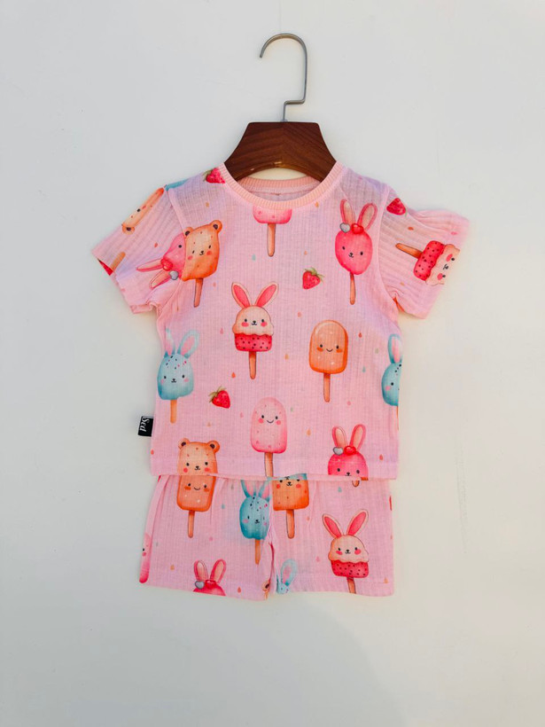 تیشرت و شلوارک راحتی پارچه ریلی طرح بستنی توت فرنگی