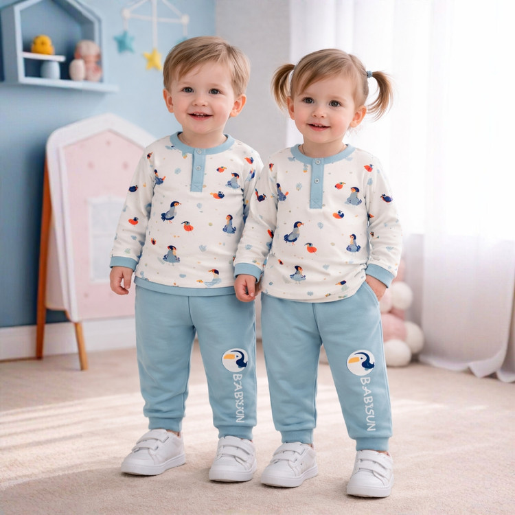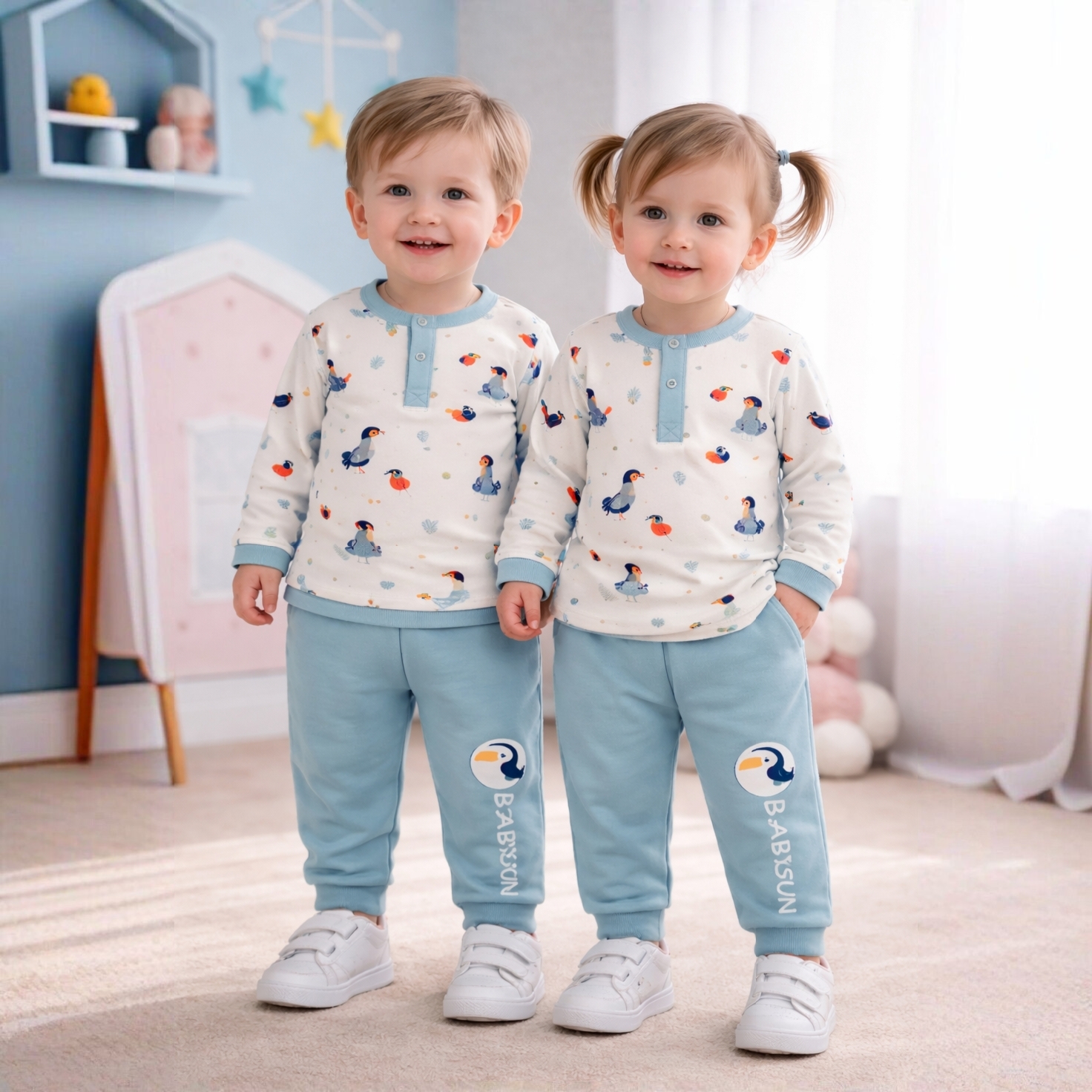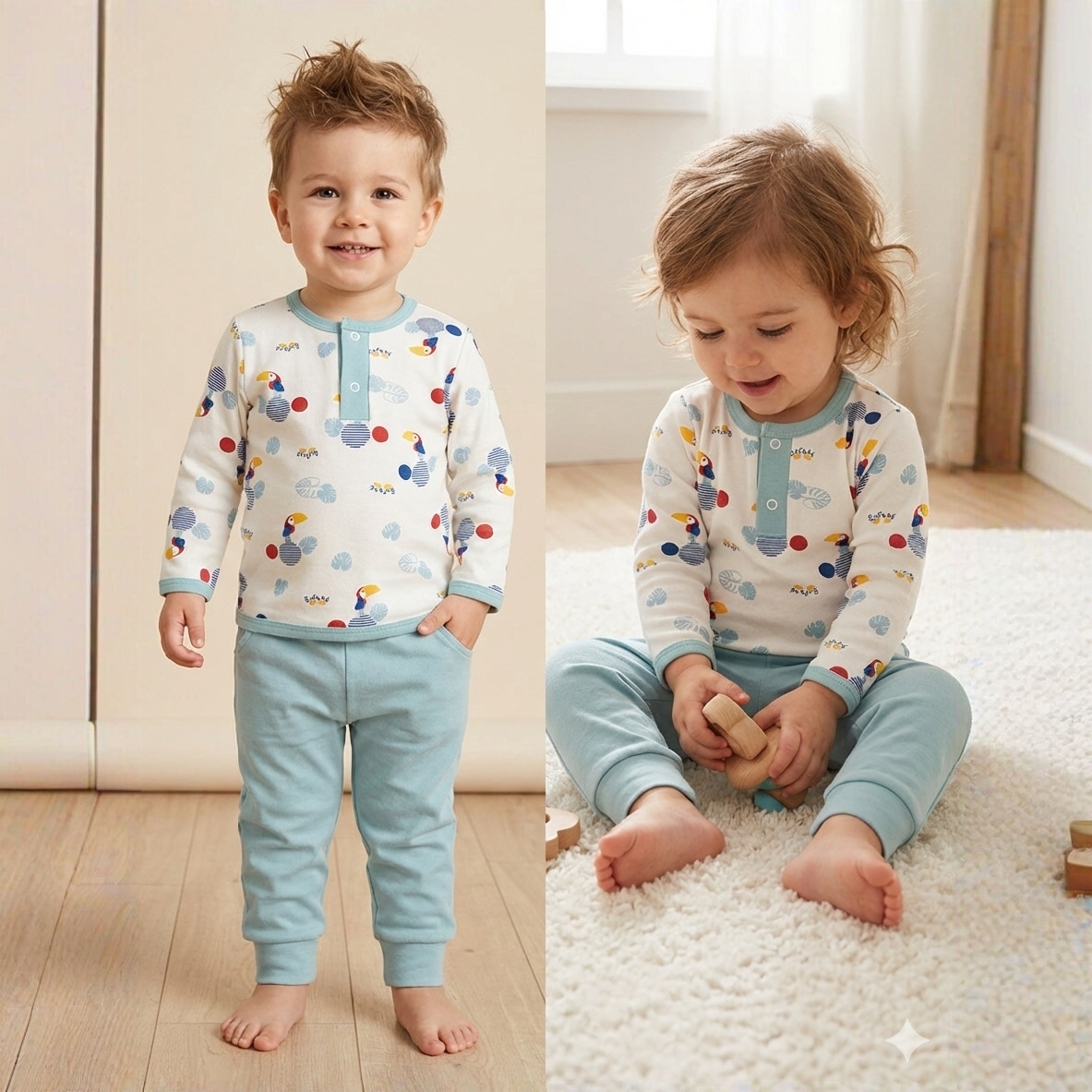 این بلوز و شلوار نوزادی طرح طوطی با دوخت استاندارد و کمر کشی نرم، راحتی کامل را برای کودک فراهم میکند.