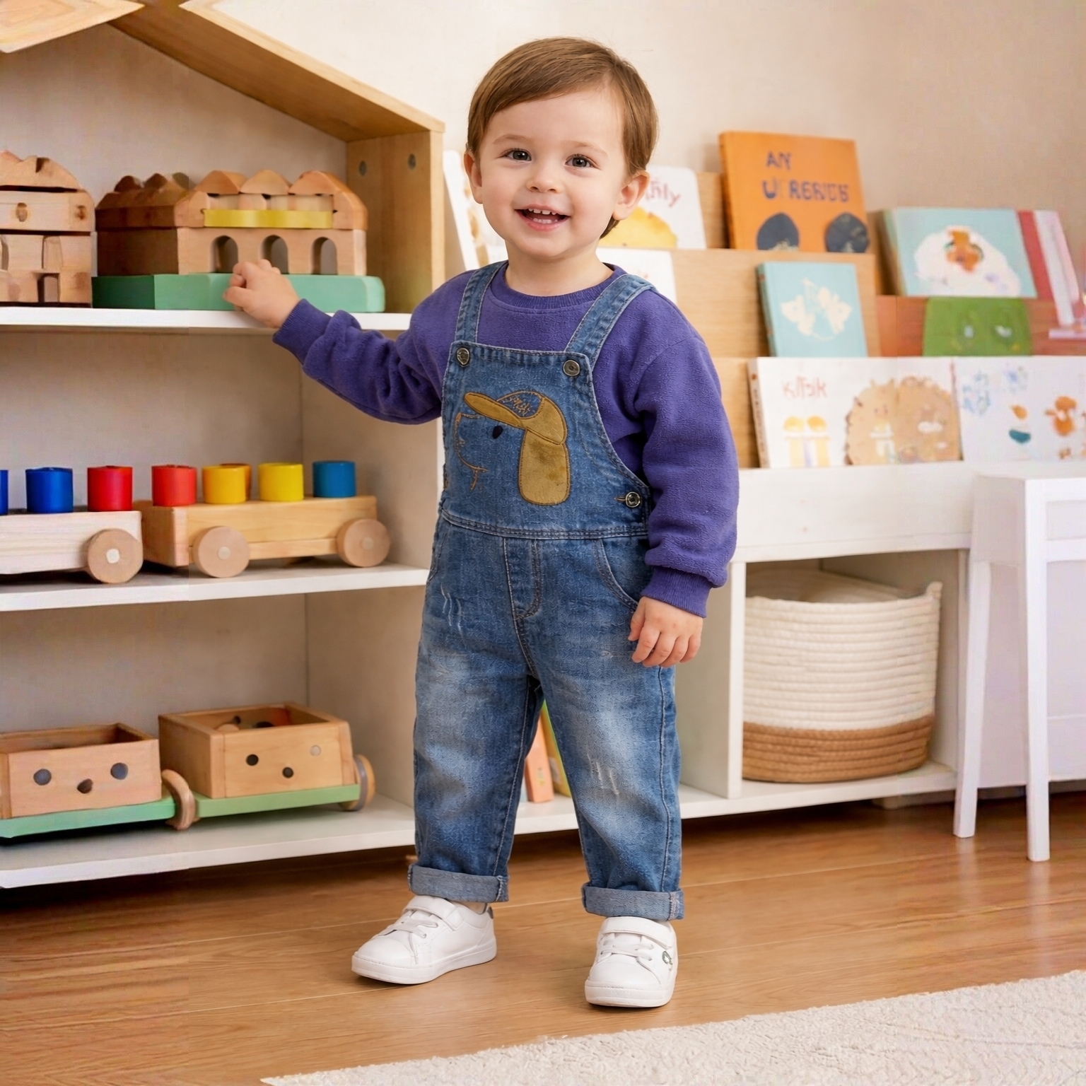 جنس این بیلر از جین نرم و باکیفیت است که علاوه بر زیبایی، دوام و راحتی بالایی دارد. به دلیل طراحی بنددار و آزادی حرکت، کودک میتواند در طول روز بدون هیچ محدودیتی از این لباس استفاده کند.
