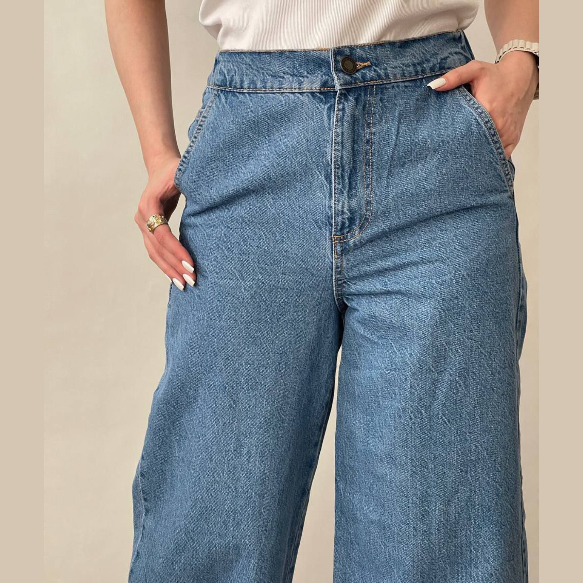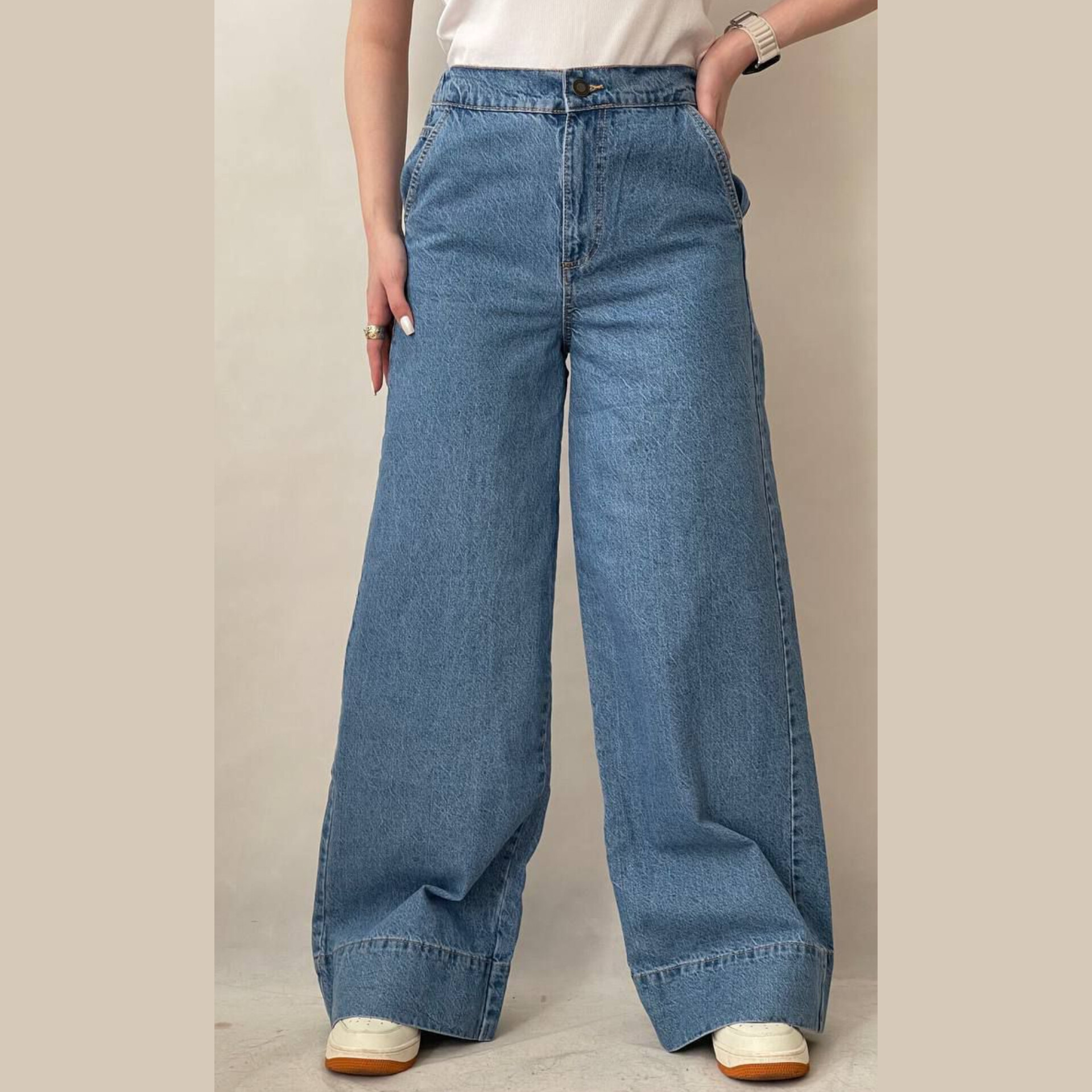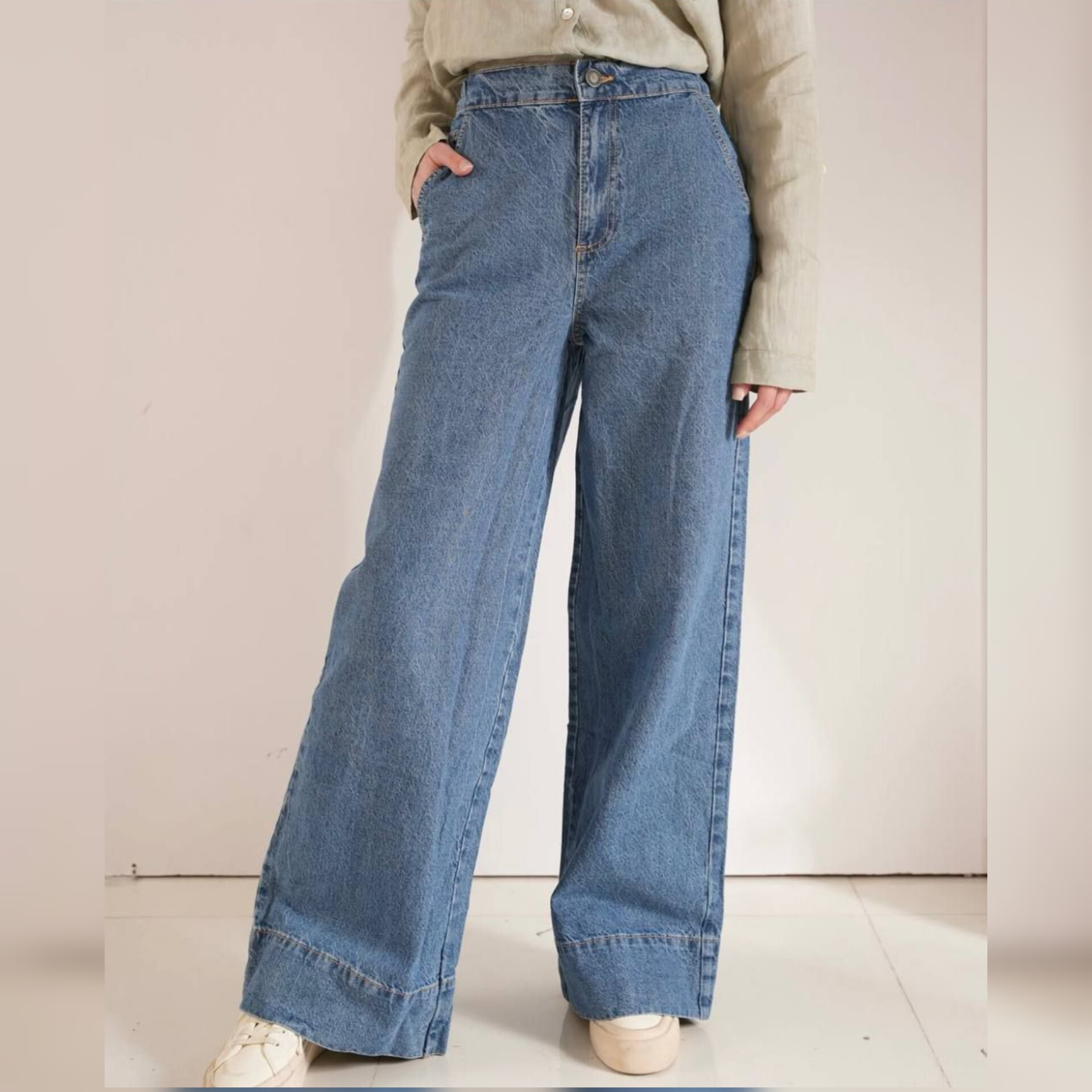 شلوار جین کاغذی فول بگ زنانه برند Primark محصول انگلیس مناسب سایز 36 تا 46 ، کمر این کار از پشت کشی بوده و فاقد جای کمربند است رنگ و شست که رنگ جدید زیبا و جزو پرفروشترین رنگ های سال است.قد کار بلند بوده واز108سانتی متر تا 118سانتی متر متغیر است بستگی به سایز کار دارد.این مدل دارای سایزبندی بوده که در ادامه توضیحات اندازه هر سایز به تفکیک نوشته شده که باتوجه آن میتوانید سایز دلخواه خود را انتخاب کنید.دوخت و اندازه این کار استاندارد بوده چون کمر این مدل کشی هست،به راحتی کار اضافه میکند.